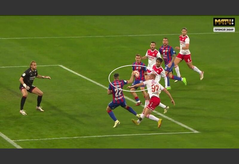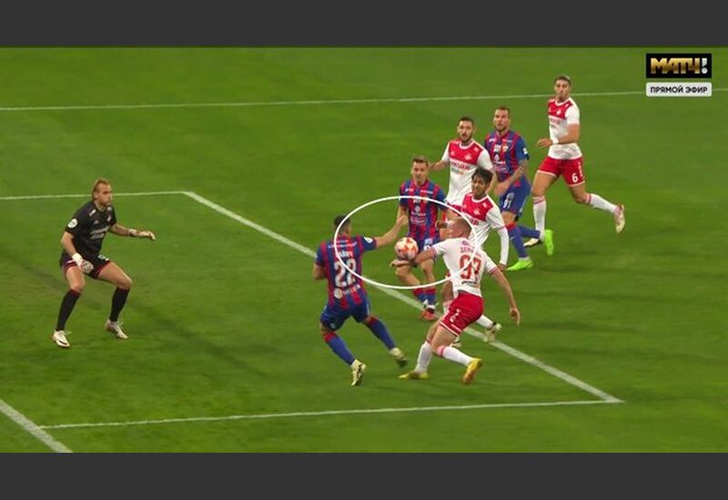 Пожалуй, первый эпизод, заслуживающий внимания, произошел на 22-й минуте. Когда в площади ворот «Спартака» боролись за позицию и мяч Даниил Денисов и Милан Гайич. Очевидно, что защитник красно-белых сыграл в мяч левой рукой. И, возможно, мгновением ранее мяча правой рукой коснулся Гайич.