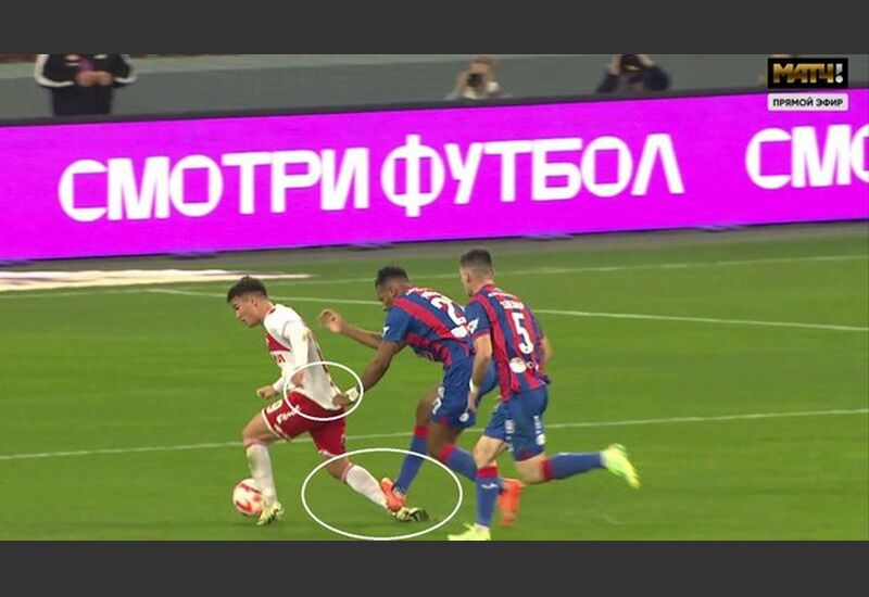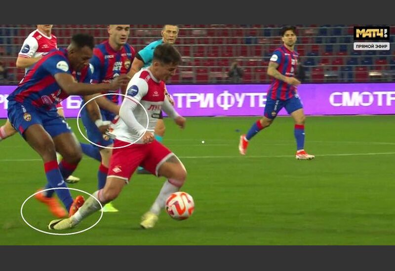 В том моменте футболист ЦСКА, прерывая проход соперника, не только схватил его за майку, но и наступил сзади на ногу открытыми шипами, рискуя нанести серьезную травму.