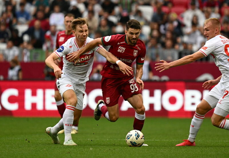 Однако — даже при преимуществе во владении мячом — с ходу завладеть инициативой у красно-белых не получилось. Все-таки «Рубин» — команда более цельная и системная. А единственный за пять туров провал в гостях у ЦСКА (1:5) с лихвой перевешивают три победы и отыгрыш двух мячей у «Зенита» со спасительным голом на последней минуте. Вот и красно-белые довольно быстро прочувствовали на себе все козыри команды Рашида Рахимова — плотность между линиями, дисциплинированную и насыщенную оборону, опасные стандарты и взрывные действия одного из лучших снайперов РПЛ Даку.