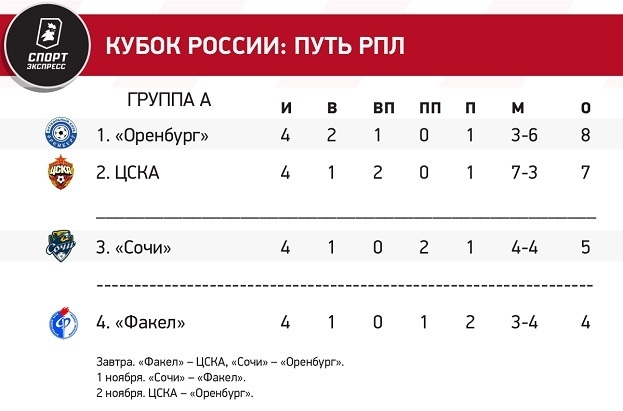 Оба участника четвертьфиналов Пути РПЛ от группы А могут стать известны уже сегодня. Случится это, если «Оренбург» и ЦСКА одержат гостевые победы. В таком случае в ноябре паре лидеров останется разыграть первое-второе места, а «Сочи» и «Факелу» — определить одного из четырех неудачников группового турнира. Зато два хозяйских успеха могут привести к уникальному итогу, при котором у всех четырех команд будет по девять очков.