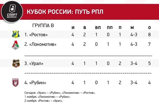 В группе В также ни одна команда не гарантировала себе попадание в плей-офф, но и шансы на кубковую весну никто не потерял. Лучше всего дела обстоят у «Ростова», которому для выхода точно хватит одного очка. Команда Валерия Карпина покинет турнир, если дважды уступит в основное время, а «Рубин» наберет пять или шесть очков.
