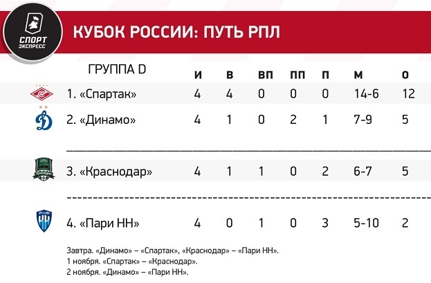 Фаворитом в борьбе за второе место остается «Динамо», которое превосходит «Краснодар» по важнейшему из дополнительных показателей — очкам в очных встречах (бело-голубые победили дома и уступили по пенальти на выезде). «Быкам», чтобы стать вторыми, нужно набрать больше очков, чем команда Марцела Лички, и не пропустить еще сохраняющий шансы на проход «Пари НН».