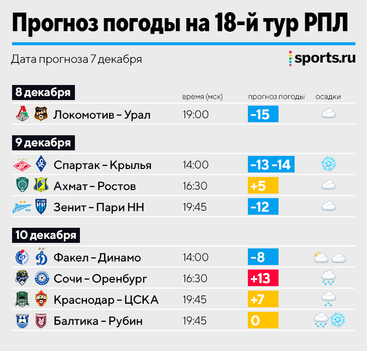 «Спартак» – «Крылья Советов», 9 декабря, 14:00: минус 13-14 (ощущается как минус 20), снег. Прогноз на грани: один-два градуса могут поменять многое (хотя в чаше стадиона, возможно, будет теплее).