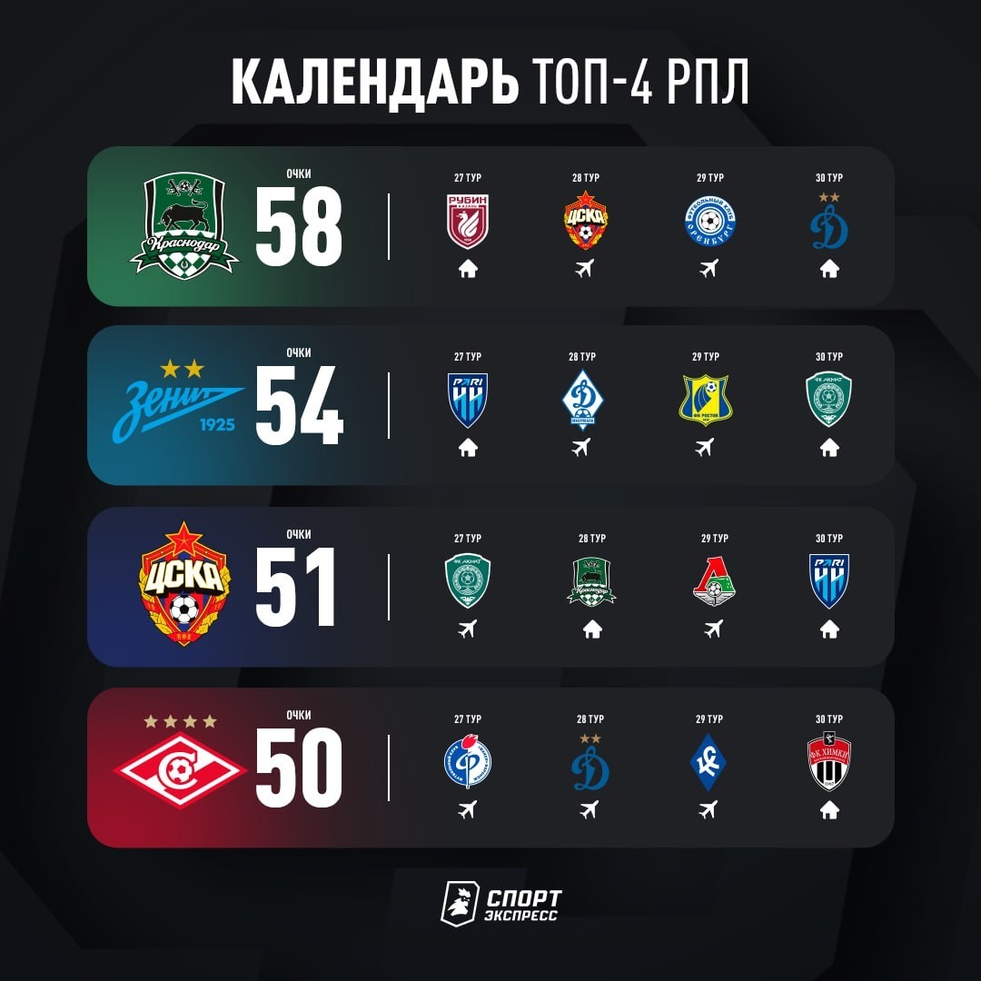 Ничья в матче с «Динамо» осложняет жизнь команде Сергея Семака — отставание от «Краснодара» увеличилось до четырех очков. Петербуржцам в оставшихся четырех турах надо только побеждать, но по расписанию у них два подряд непростых выезда в Каспийск и Ростов-на-Дону.