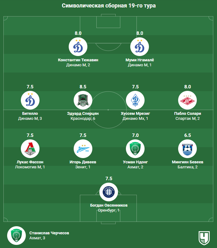 Завершился 19-й тур МИР Российской Премьер-Лиги. По традиции по итогам восьми прошедших матчей выделяем главных героев и составляем символическую сборную недели. В команду лучших игроков уикенда попали представители сразу девяти клубов – московского и махачкалинского «Динамо», «Спартака», «Оренбурга», «Локомотива», «Краснодара», «Ахмата», «Зенита» и «Балтики». Футболисты расставлены в рамках условной тактической схемы 4-4-2. А тренер тура – с юга России.