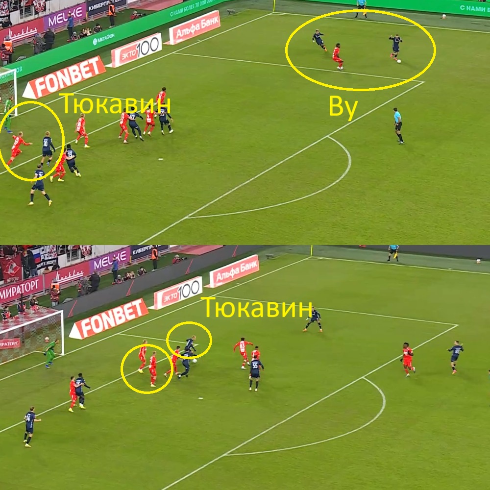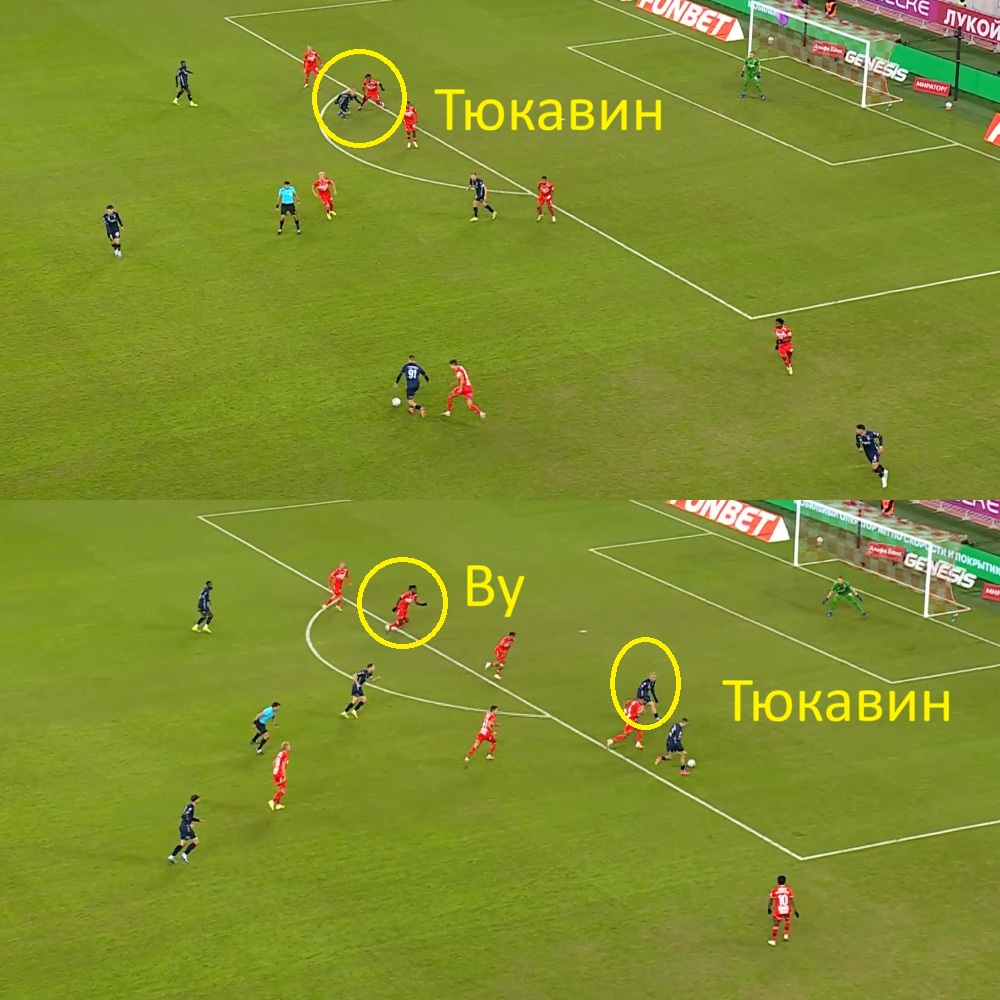 В одном из эпизодом во втором тайме спартаковцы упустили в штрафной Тюкавина — момент чудом не закончился голом. Хотя его не должно было быть: Ву опекал Тюкавина, но стоило тому убежать в другую зону — защитник бросил его.