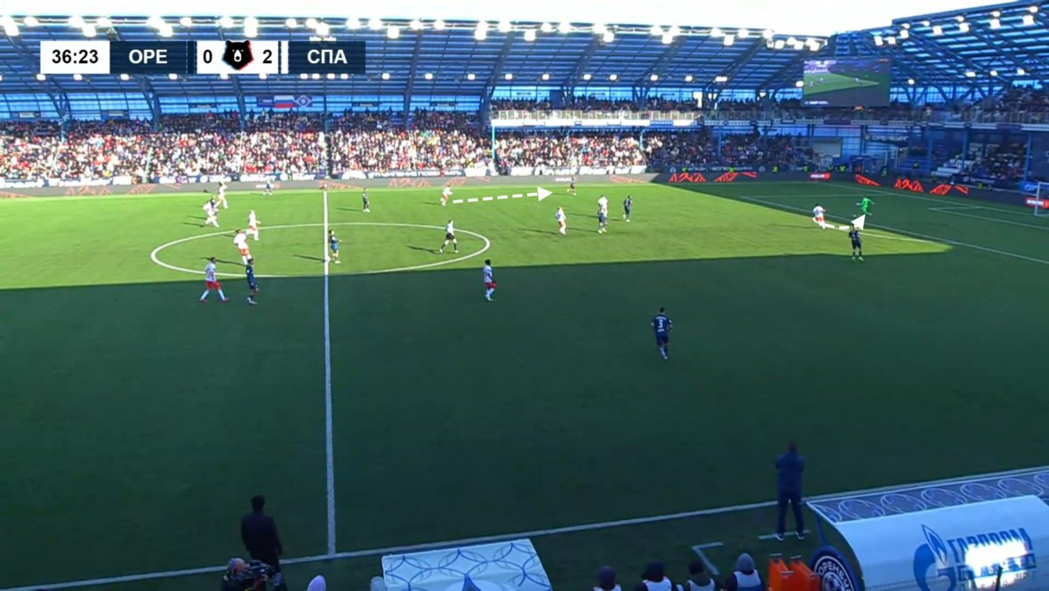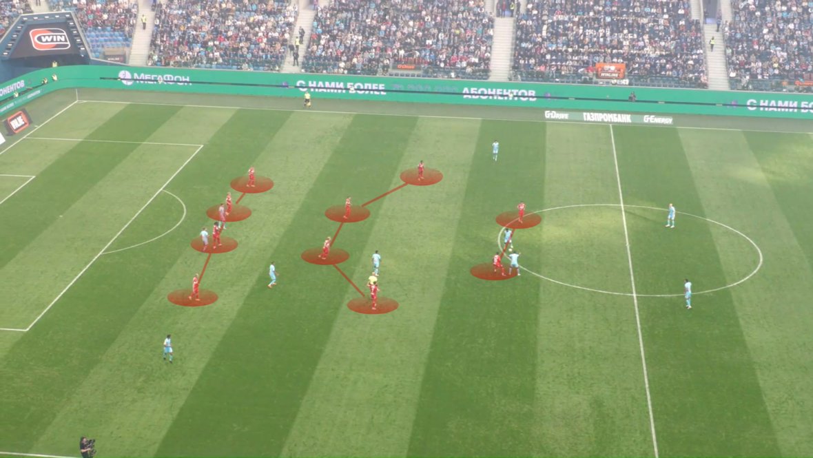 Среагировав на 4-4-2 / 4-2-4 от футболистов Ролана Гусева, команда перестроилась: тройка в первой линии розыгрыша начала разыгрывать мяч, а +1 в центре сделал сместившийся к Умярову Зобнин. Такой же прием эпизодически использовался и в перестрелке с «Акроном». А на выезде против «Оренбурга» к двойке перед Максименко опускался Литвинов — причем и правым крайним, и центральным защитником.