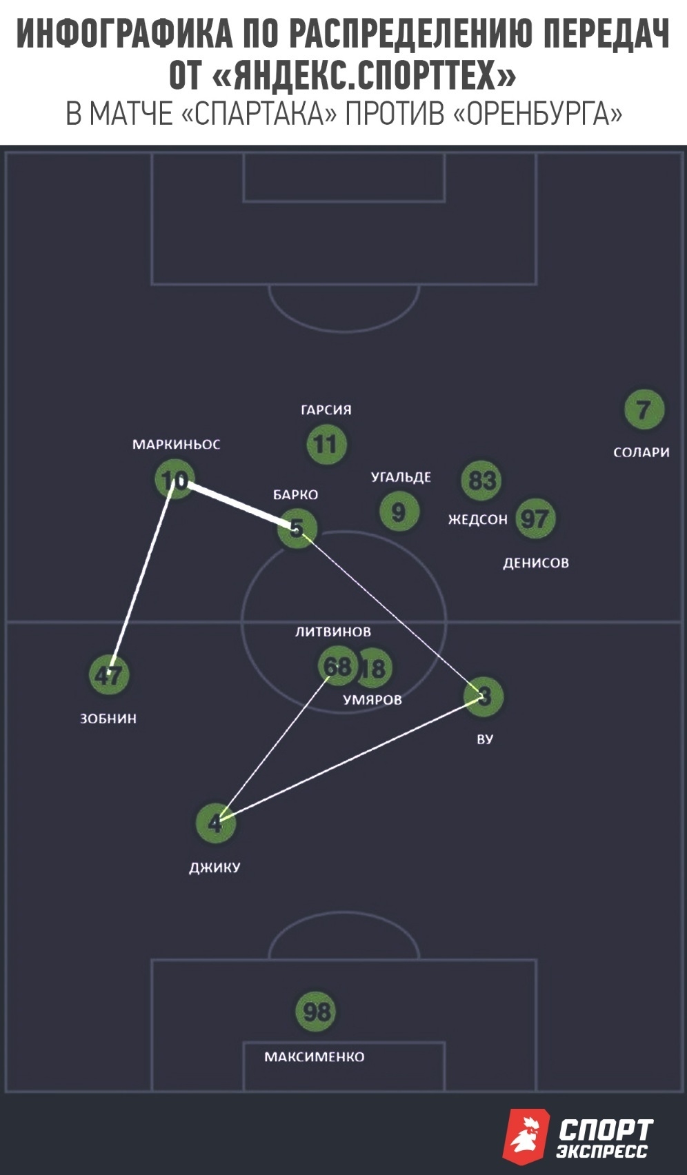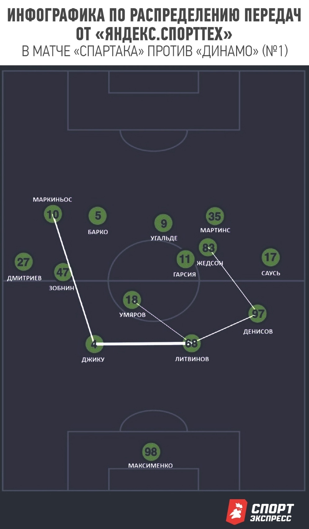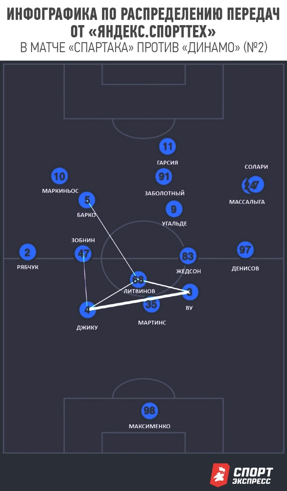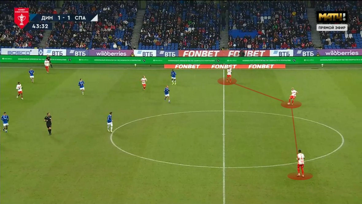 Отчасти искомый баланс был соблюден в ответном кубковом матче против «Динамо», но решение с разведением Барко и Жедсона по разным частям поля сделало «Спартак» куда менее острым, хотя контекст матча требовал перекоса в сторону атаки с первых минут. К тому же слева отсутствовал Дмитриев, показавший себя одной из ключевых фигур в переходных фазах и для доставок мяча в штрафную.