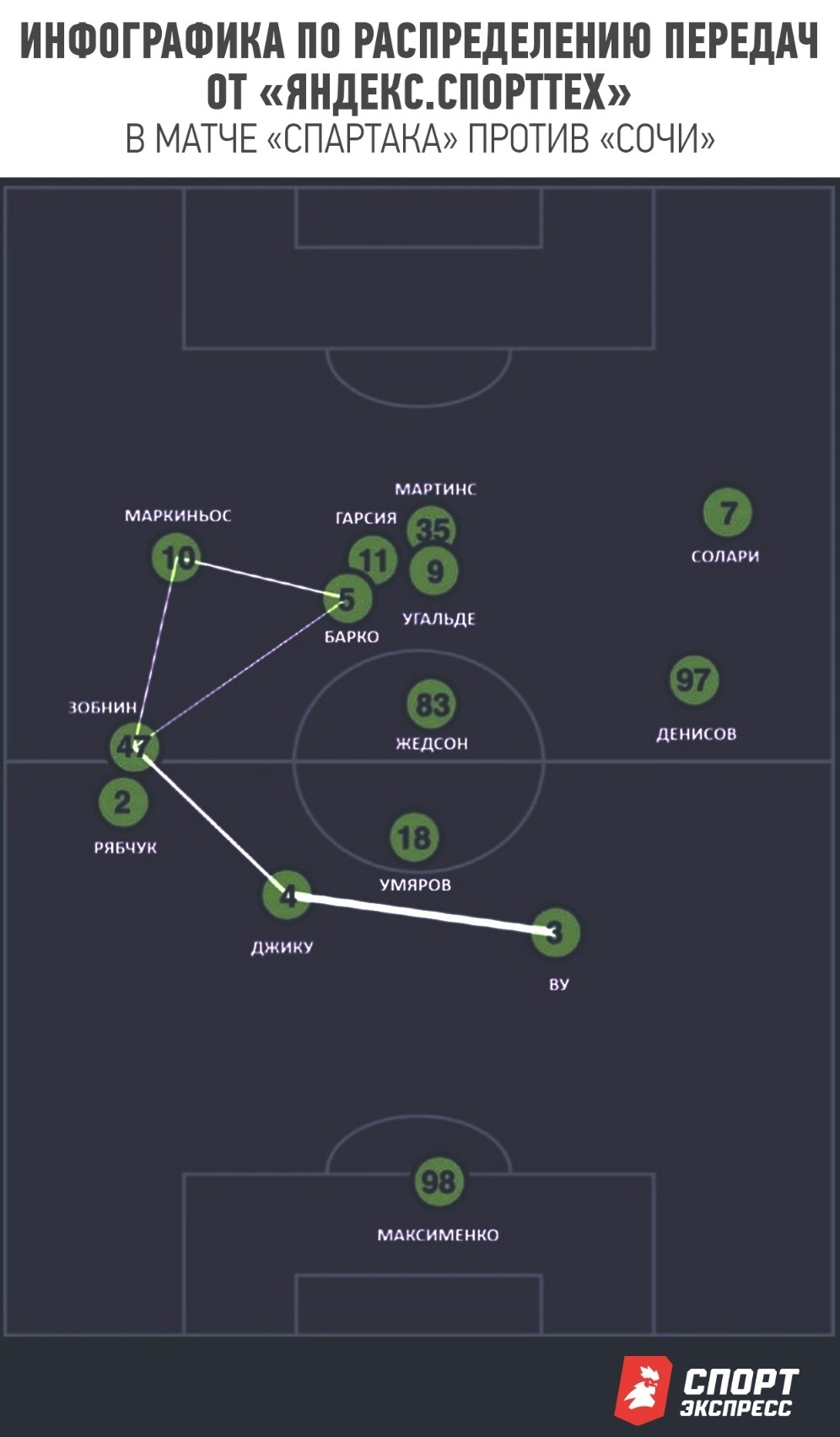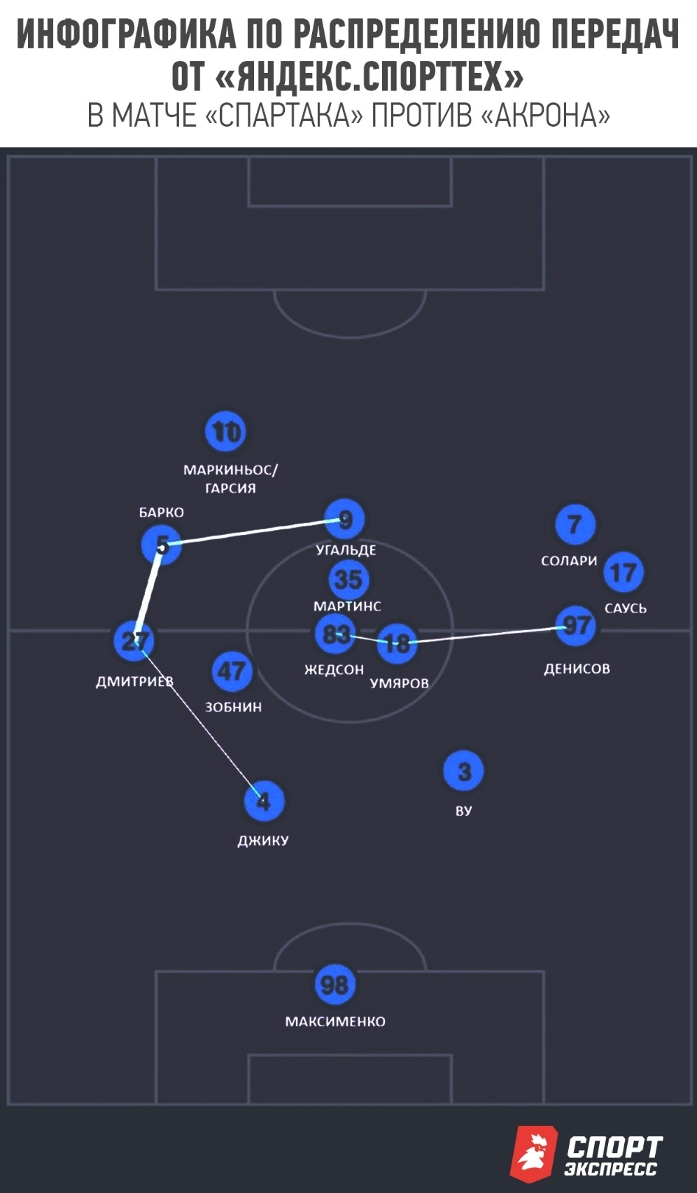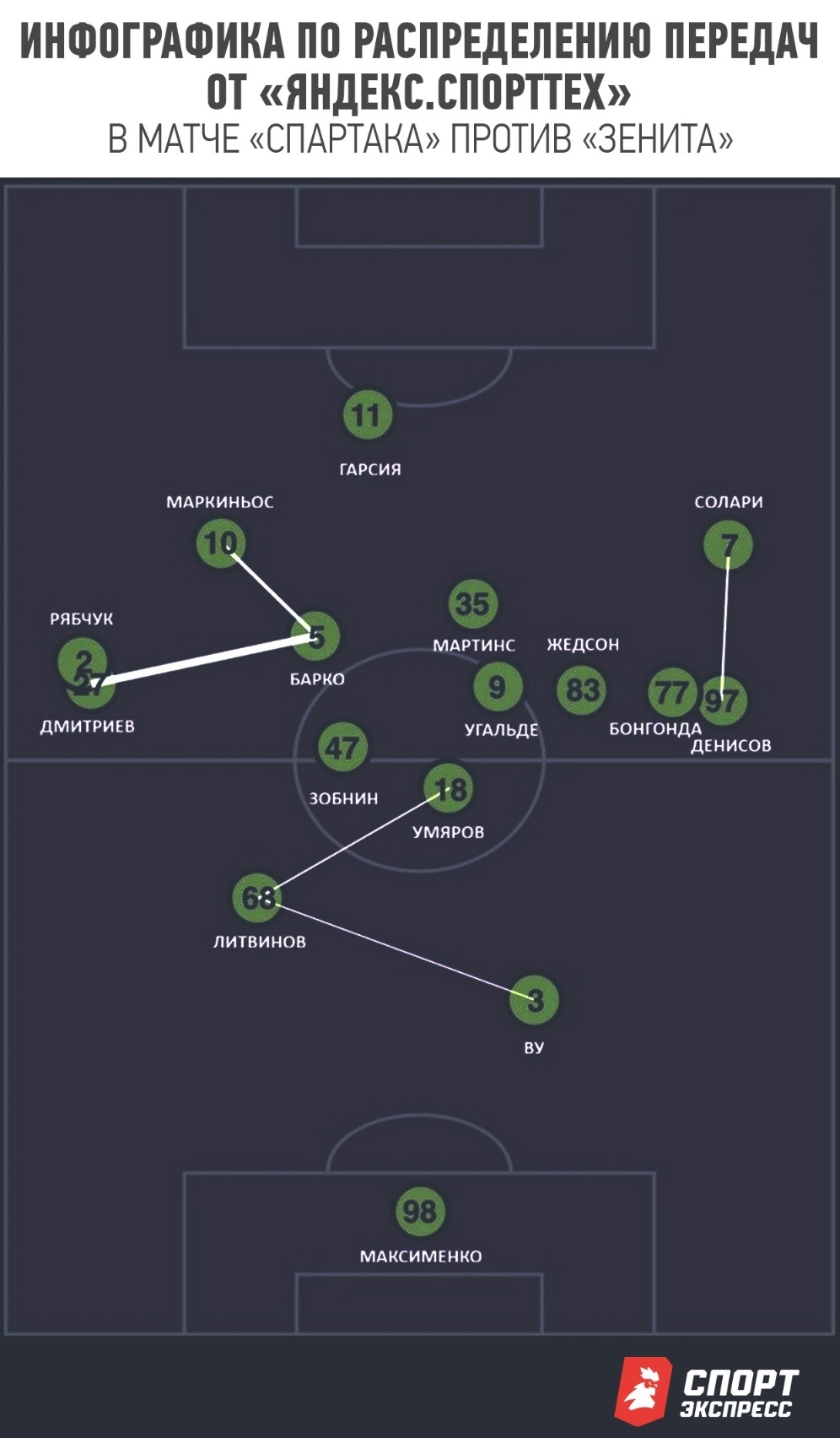 Отчасти искомый баланс был соблюден в ответном кубковом матче против «Динамо», но решение с разведением Барко и Жедсона по разным частям поля сделало «Спартак» куда менее острым, хотя контекст матча требовал перекоса в сторону атаки с первых минут. К тому же слева отсутствовал Дмитриев, показавший себя одной из ключевых фигур в переходных фазах и для доставок мяча в штрафную.