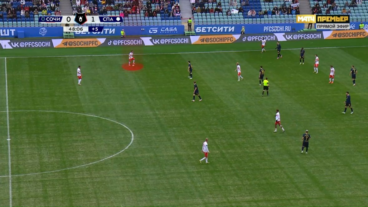При этом «Спартак» не ориентируется на статус соперника — может адаптироваться и под команды нижней половины таблицы: «Сочи» перекрывает центр и не дает продвигать мяч через Умярова — ничего страшного, мы будем развивать атаки через ротации фланговых игроков (Денисов поднимется выше, а Солари опустится за мячом); соперник сел в плотный низкий блок — Барко поменяется местами с крайним защитником, тот зайдет в полуфланг, а аргентинец заберет мяч и будет развивать атаку на индивидуальном мастерстве.