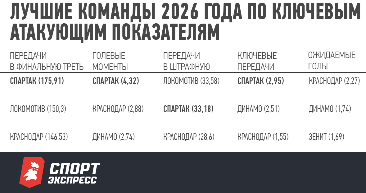 Статистические показатели «Спартака» в атаке и завершении после возобновления чемпионата весьма показательны — команда вторая в лиге по передачам в финальную треть, ключевым пасам и голевым моментам, вторая по передачам в штрафную за 90 минут. По ожидаемым голам красно-белые занимают четвертую строчку, немного уступая «Зениту» (1,62).