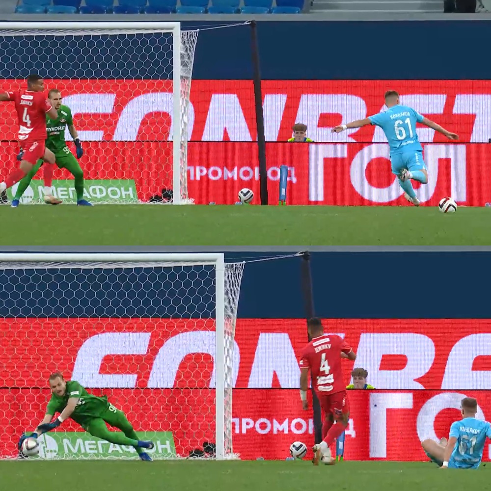 Латышонок заслуживает похвалы, хотя манера Барко стала предсказуемой — прямо перед ударом он замедляется, чтобы спровоцировать вратаря на действие, а потом бьет в пустой угол. Барко бьет так почти всегда, поэтому многие вратари РПЛ перестали гадать, играя по мячу.