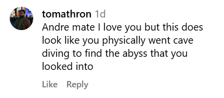 «Андре, брат, люблю тебя, но это выглядит так, будто ты физически отправился в пещеру, чтобы заглянуть в ту самую бездну внутри себя».